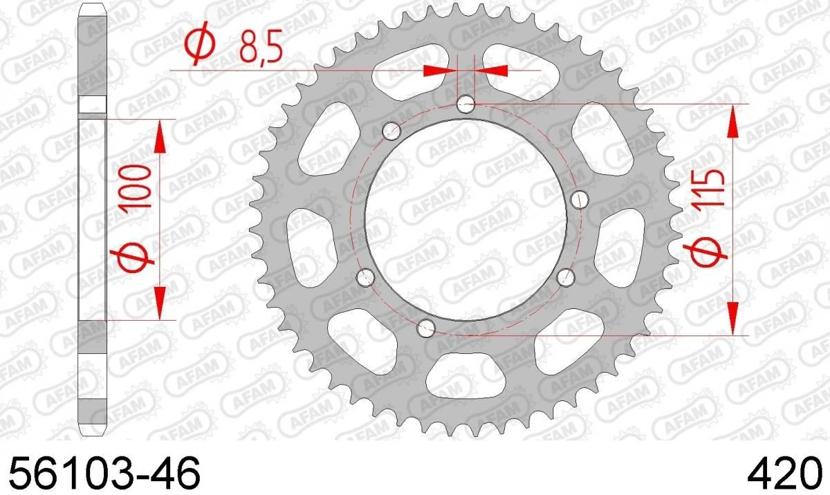 Een stalen 46 tands AFAM achtertandwiel. De tandwielen van AFAM zijn gemaakt van C45 staal met inductie geharde tanden, het tandprofiel is concentrisch, plat en perfect rond. Door deze samenstelling zijn de AFAM tandwielen perfect ter vervanging of zelfs ter verbetering van de OEM tandwielen.