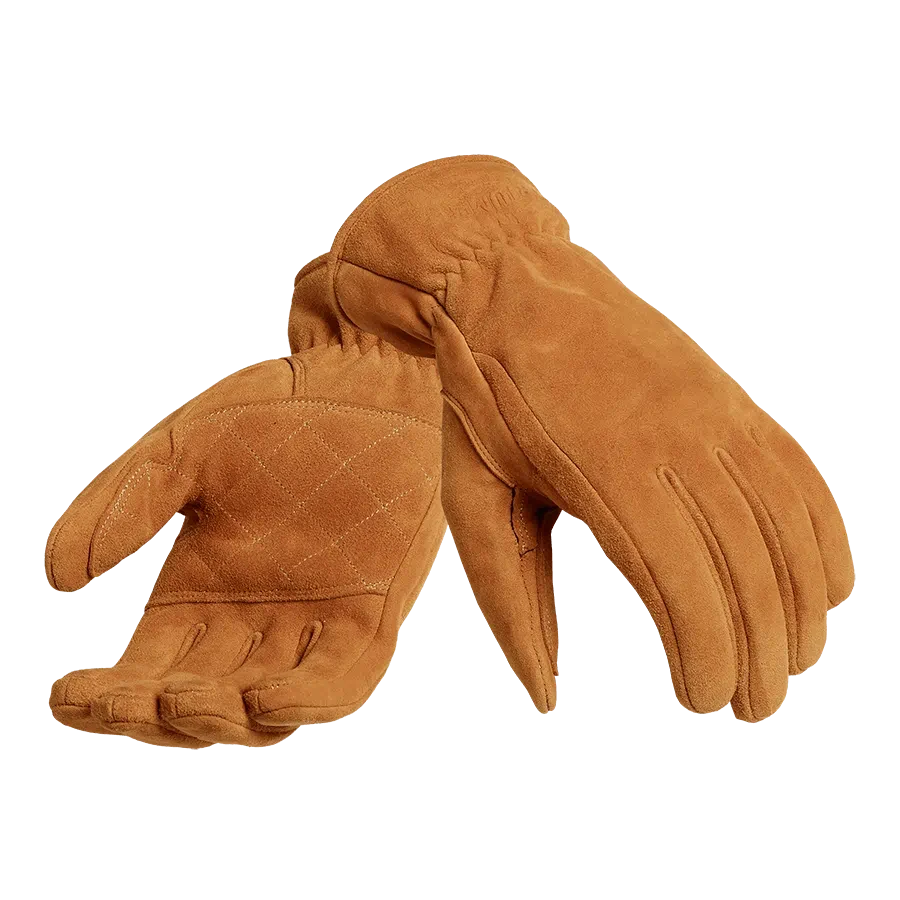 Klassieke motorhandschoen in goudbruin suède, met elastische pols. Een licht gewatteerde handpalm, voorgevormde vingers en ademende Mesh voering verhogen het rijcomfort bij warm weer.