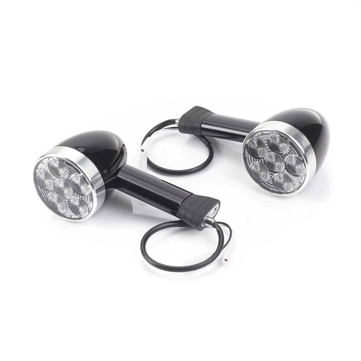 Een set van 2 kogelvormige ledrichtingaanwijzers die uw motorfiets een uniek karakter geven. Ontwikkeld als directe vervanging van de standaardonderdelen. Voorzien van een huis met satijnen afwerking, oranje ledrichtingaanwijzers en blanke lenzen. Biedt een kleinere kop voor leds van 40 mm en kleinere (middelmaat) steel in vergelijking tot het originele onderdeel.